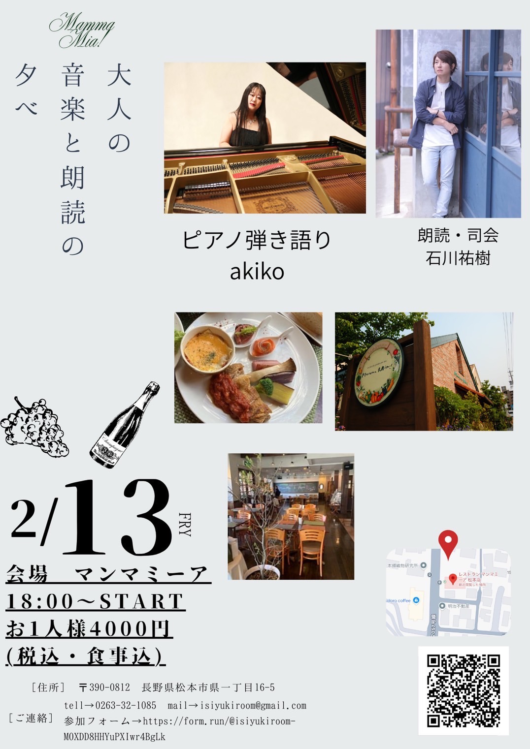 【松本市】バレンタイン前日の素敵なイベント。美味しいお料理と一緒に楽しむ「大人の音楽と朗読の夕べ」が2月13日にマンマミーアで開催されます。