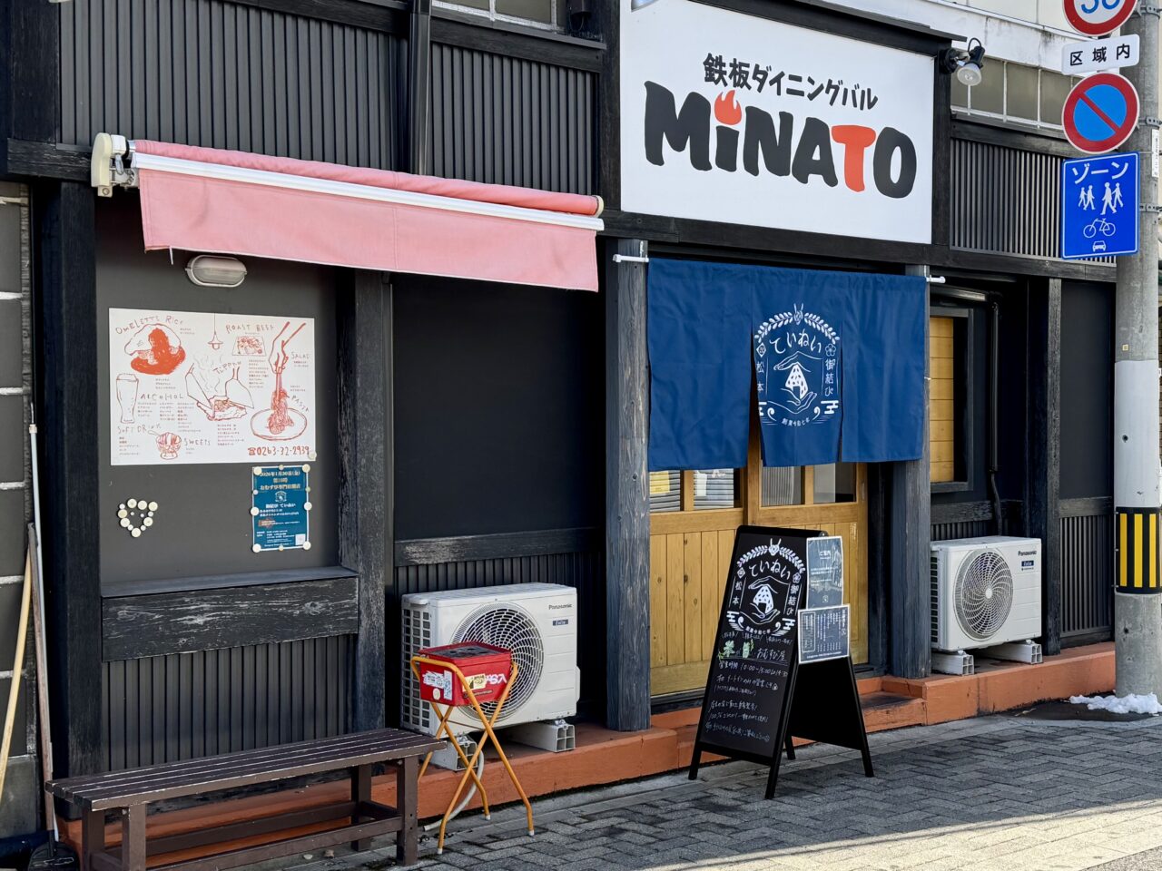 鉄板ダイニングバルMINATOの看板の下に、綺麗な青い暖簾がかかっていました。
