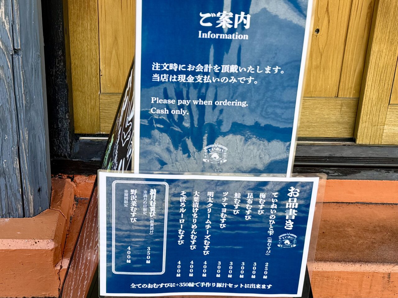 お品書きには全てのおむすびにプラス料金で手作り豚汁セットに出来ますと書かれていました。また、現金支払いのみとなっています。
