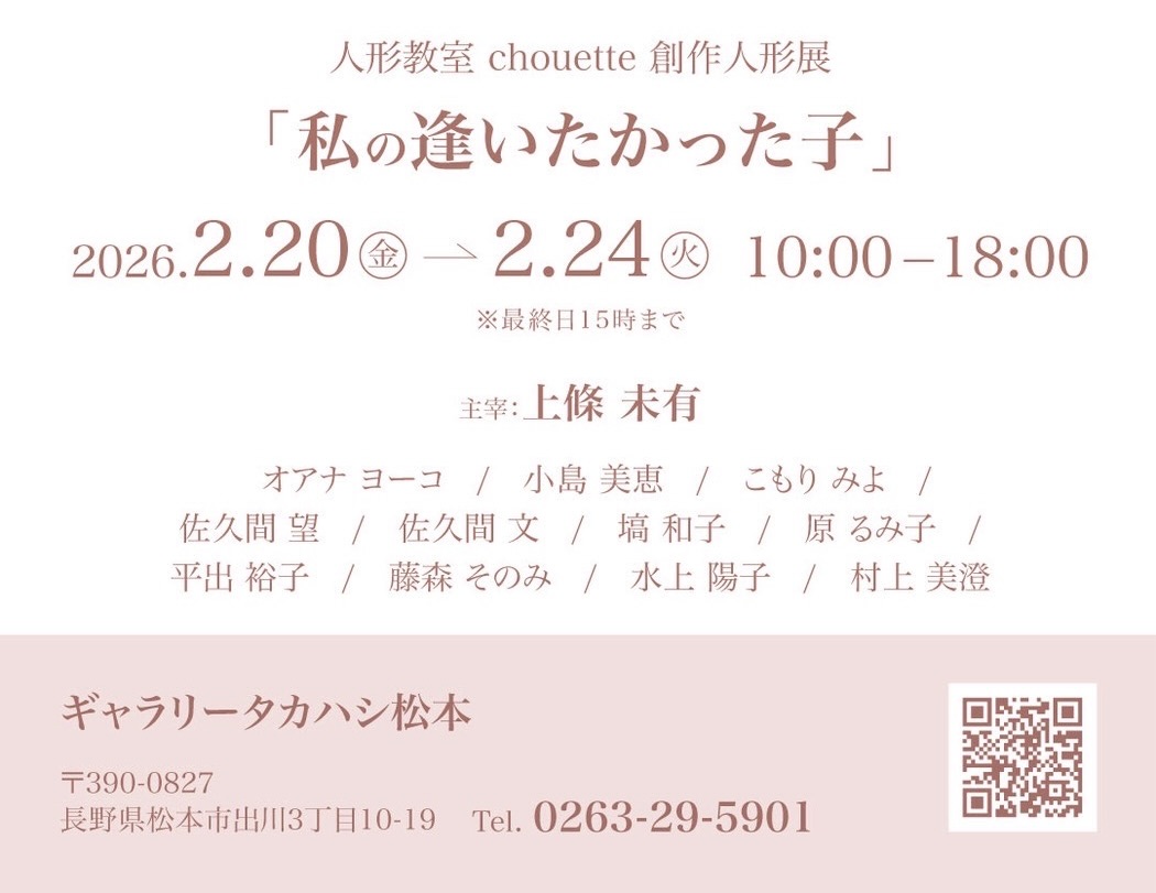とても可愛いお顔にお洋服、つい見入ってしまう球体関節人形(関節部分が球体で出来ていてポーズを変えることができるお人形)を製作している人形教室「chouette (シュエット)」の創作人形展が2026年2月20日から出川のギャラリータカハシ松本で開催されます。