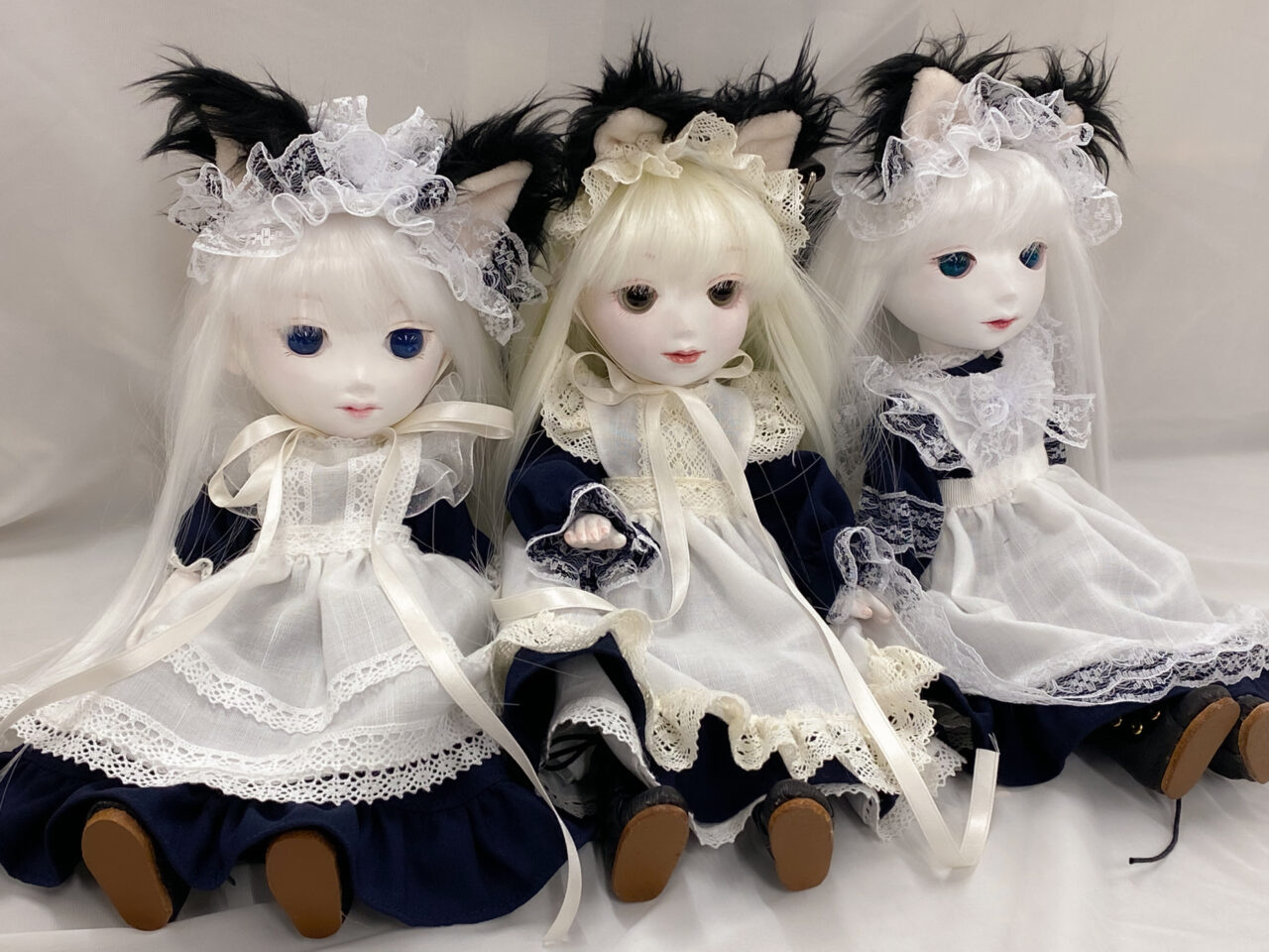 こちらの3体のお人形は「自分自身ではとても着れないかわいい服を代わりに着せて、夢を見させてもらっています。」とのこと。白いお肌のお人形にレースやリボンなどがたっぷり入ってかわいいがたくさん詰まっていますね♪