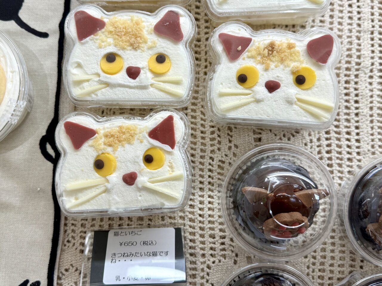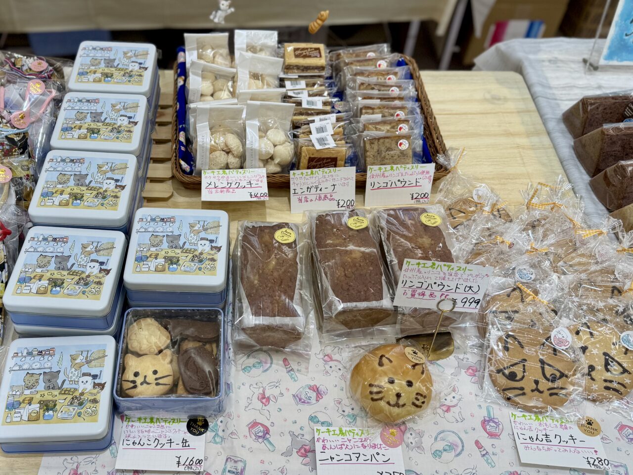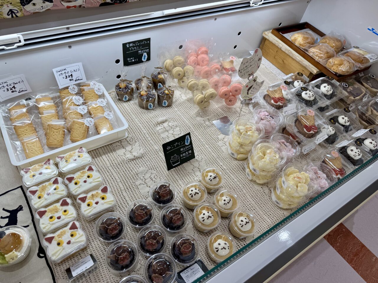 ケーキ工房パティスリーの商品がこちら。右下の可愛くておもしろ顔の「にゃん吉クッキー」が気になります。お子さまが喜びそうですね♪