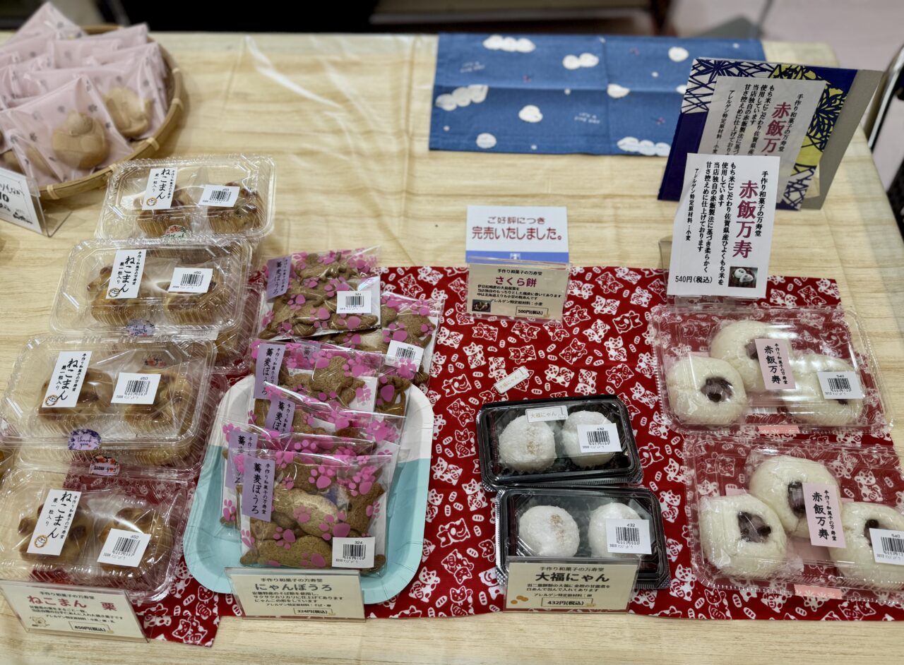 和の雰囲気の商品を出していたのは手作り和菓子の万寿堂です。ねこまんやにゃんぼうろも気になります。写真を撮影して、少し後に行ってみたら赤飯万寿が完売していました!さくら餅も完売となっています。