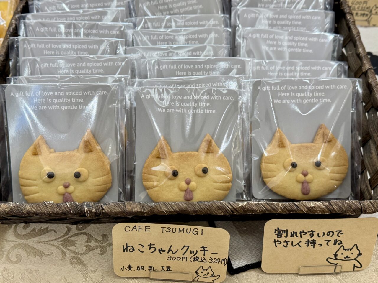 CAFE TSUMUGIのねこちゃんクッキーは表情がとっても面白いです。商品を選んでいたお客様が「こっちの顔がいいかな〜」と楽しそうに選んでいました。