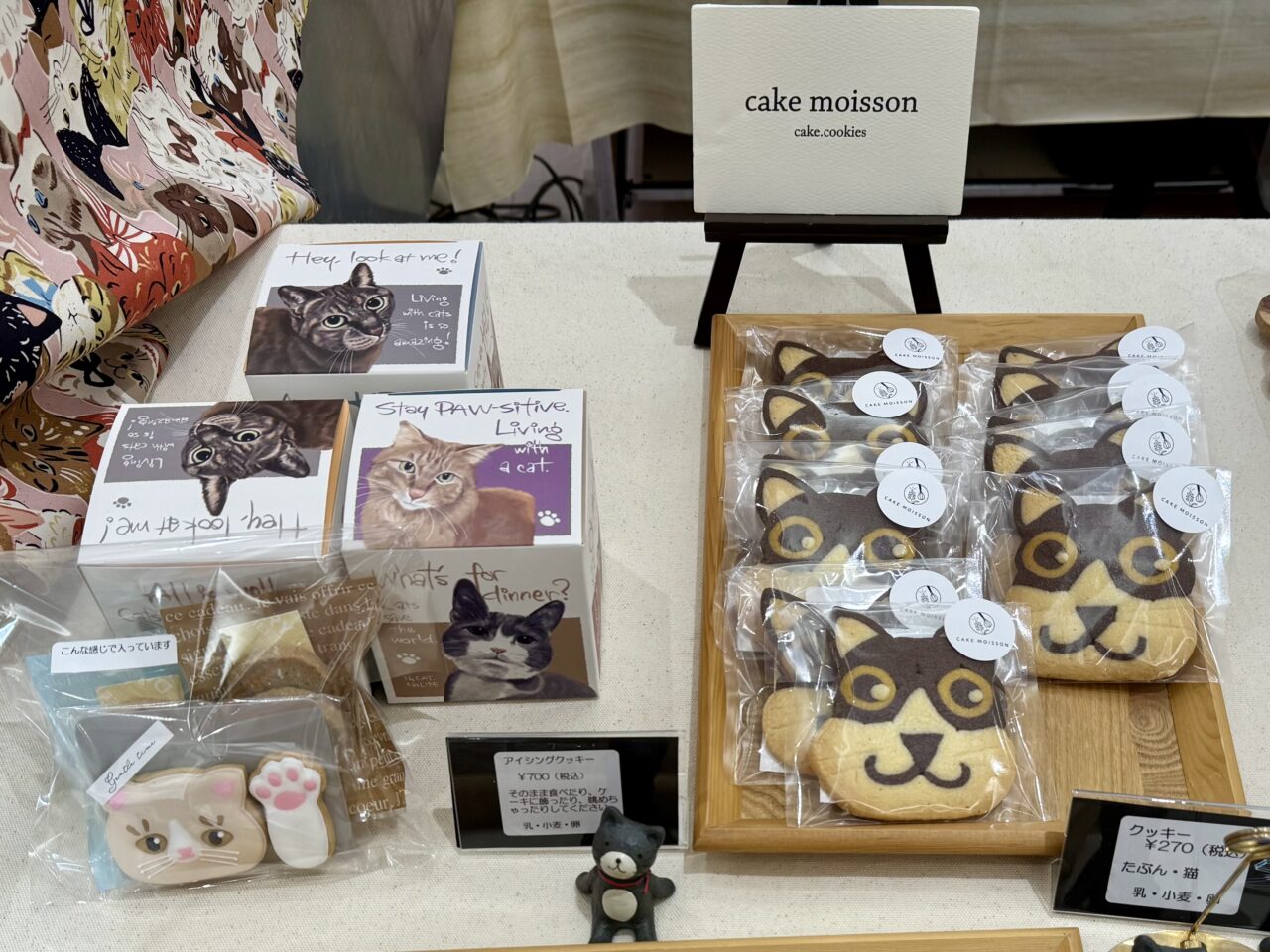 cake.moissonの猫商品は印象に残るものが多いです。下の写真右は「たぶん・猫」と書かれたクッキー。左のアイシングクッキーは猫の腕や色合いも可愛いです♪