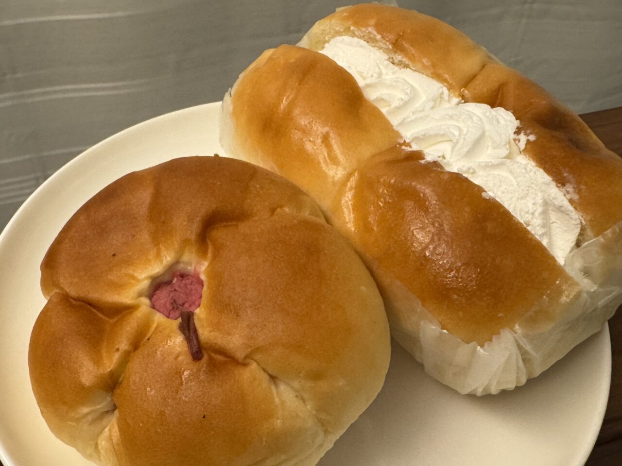 牛乳パンと桜あんぱんを購入しました!ふわふわのパン生地に甘いミルククリームがたっぷりサンドされた牛乳パン。
